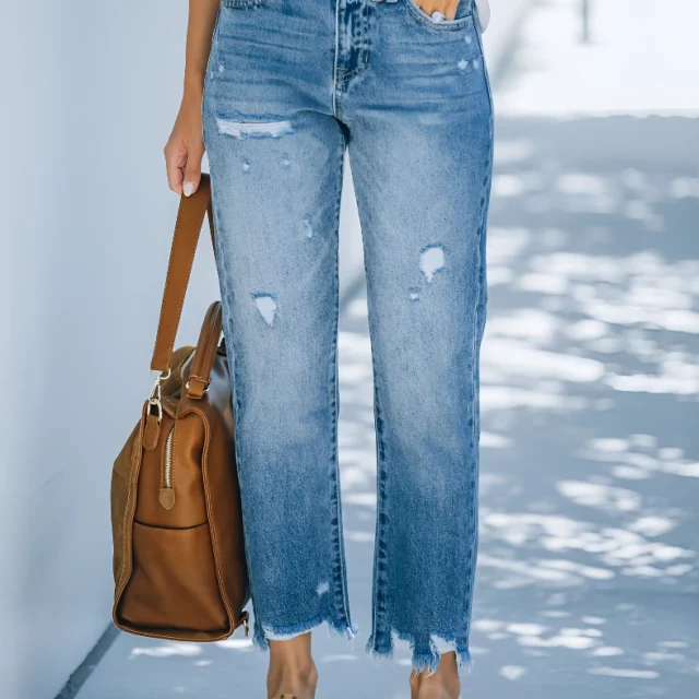 Step into the urban jungle with confidence in our latest collection of High Waist Distressed Straight-Leg Jeans. Crafted for those who dare to stand out, these jeans are a perfect blend of comfort and rugged chic. Ideal for all seasons, these versatile pants can take you from daytime errands to evening outings without missing a beat. Designed for the contemporary woman, the jeans boast a flattering high waist, a touch of stretch for comfort, and a straight leg cut that creates a timeless silhouette.